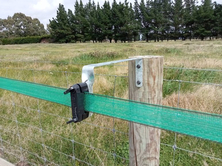 Galvanised steel outriggers, 30cm long these outriggers are robust and the Y Post insulators clip on and tension the tape to each post. These insulators sell individually for $2.50 each. Outrigger and insulator $6.50. We suggest you use an insulator end at the start and finish of your tape to pull it tightly.